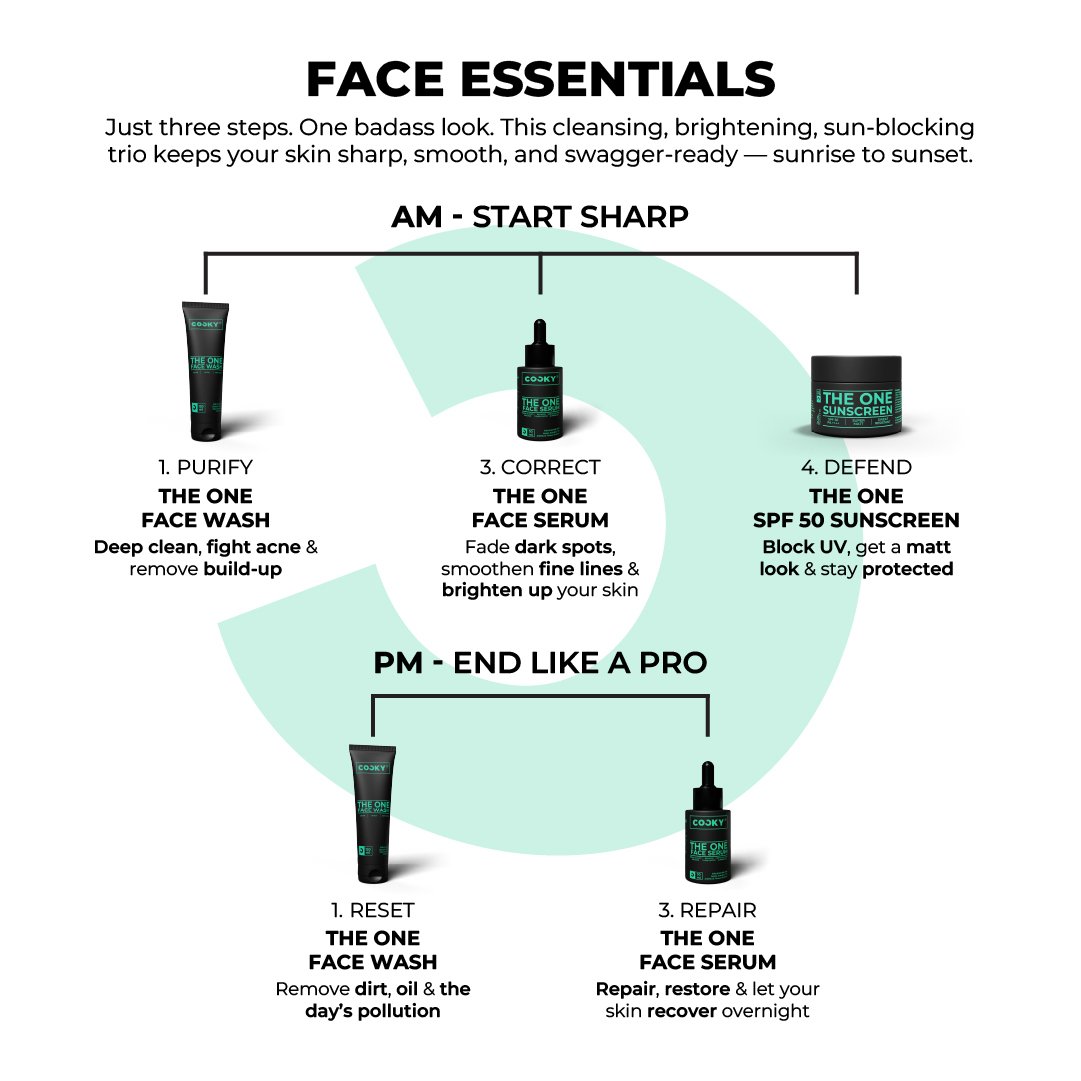 Face Off Combo for Men | Daily Face Essentials Kit with The One Face Wash, Face Serum & Sunscreen | Deep Cleansing, Brightening, Oil Control & Sun Protection | Powered by Niacinamide, Witch Hazel, Salicylic Acid, Tea Tree, Alpha Arbutin, Albiflora Flower Extract, Charcoal & Suncat DE | Sulphate & Paraben Free | 3 Product Combo